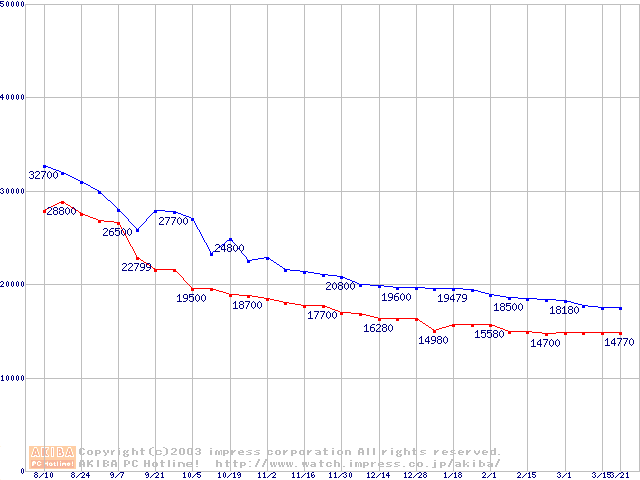 | [↑前グラフ]: | MKシリーズ (9.5mm,5400rpm,16MB,FDB,30GB/Platter)の最安値推移 |
