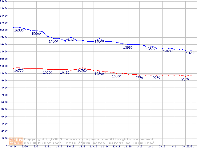 | [↑前グラフ]: | MKシリーズ (9.5mm,4200rpm,2MB,FDB,30GB/Platter)の最安値推移 |