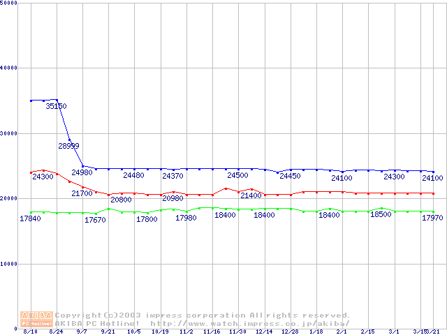 | [↑前グラフ]: | Socket 478 (micro-PGA,FSB 400MHz,L2 128KB,Willamette)の最安値推移 |