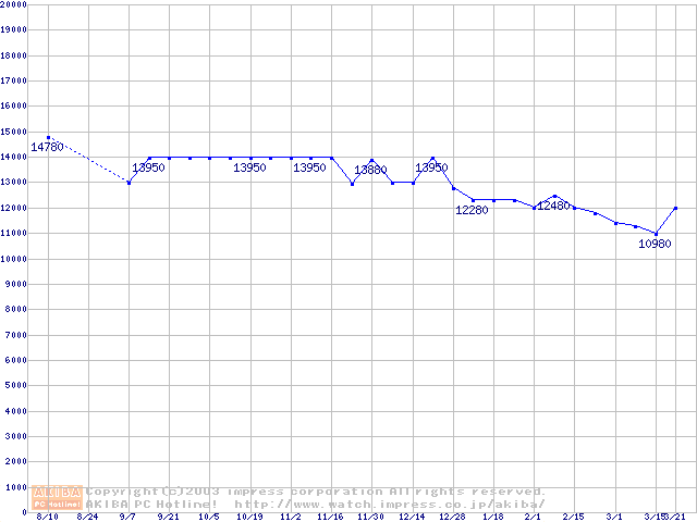 | [↑前グラフ]: | Socket 370 (FC-PGA2,FSB 133MHz,L2 256KB,Tualatin)の最安値推移 |