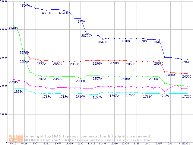 | [↑前グラフ]: | Socket 478 (micro-PGA,FSB 533MHz,L2 512KB,Northwood)の最安値推移 |