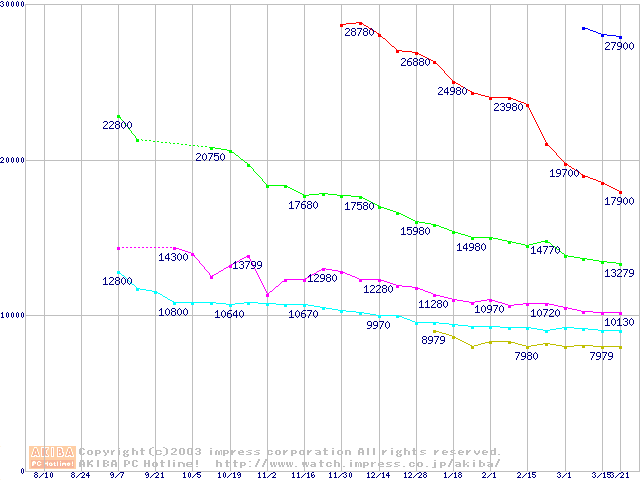 | [↓次グラフ]: | DiamondMax Plus 8 (7200rpm,2MB,UltraATA/133,FDB)の最安値推移 |