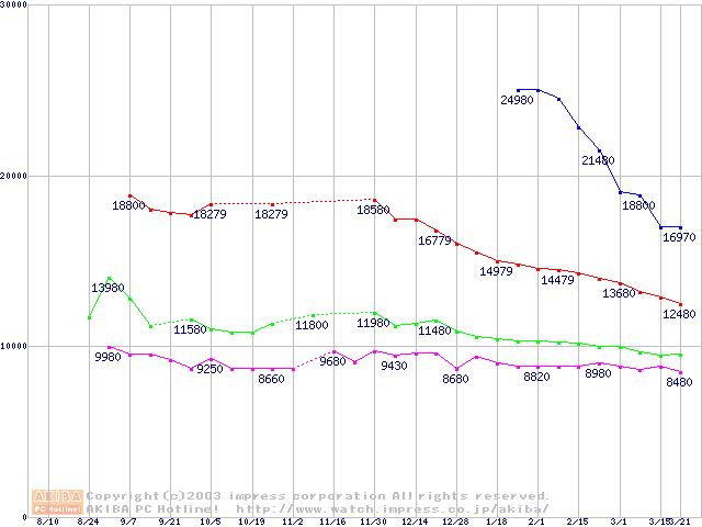 | [↑前グラフ]: | DiamondMax 16 (5400rpm,UltraATA/133,2MB,80GB/Platter,BB)の最安値推移 |