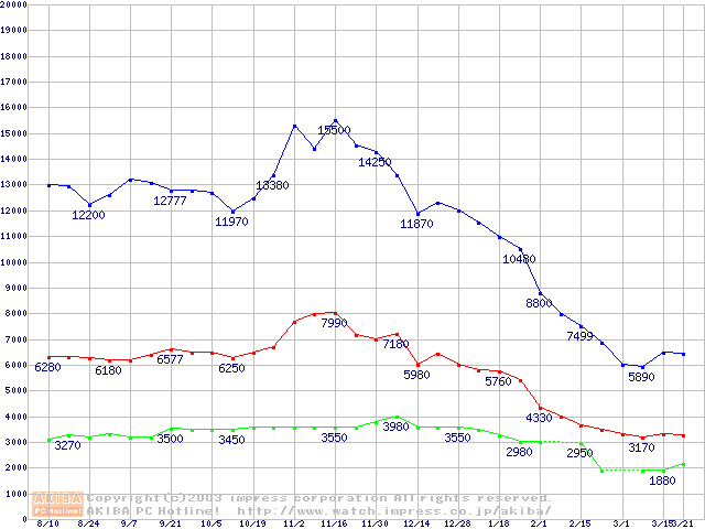 | [↑前グラフ]: | PC2100(DDR266) DDR SDRAM DIMM(CL 2.5)の最安値推移 |