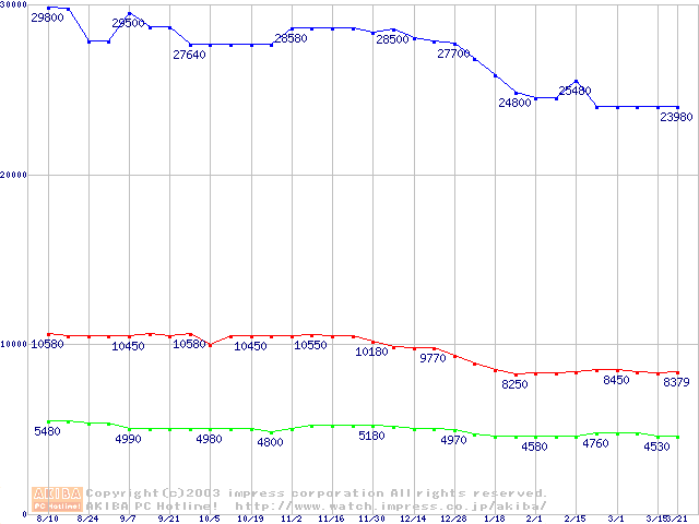 | [↓次グラフ]: | PC800-40 DRDRAM RIMM ECC対応の最安値推移 |