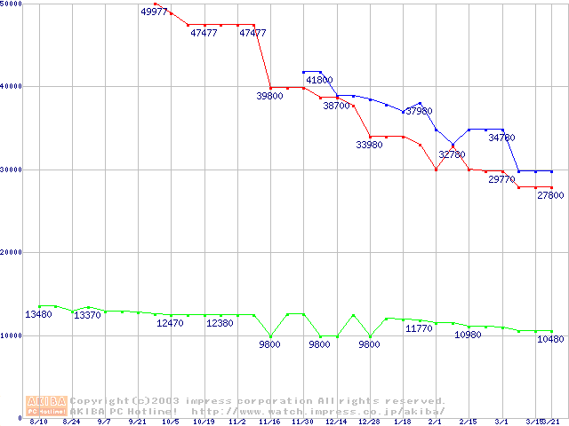 | [↓次グラフ]: | Socket 478 (micro-PGA,FSB 533MHz,L2 512KB,Hyper-Threading,Northwood)の最安値推移 |