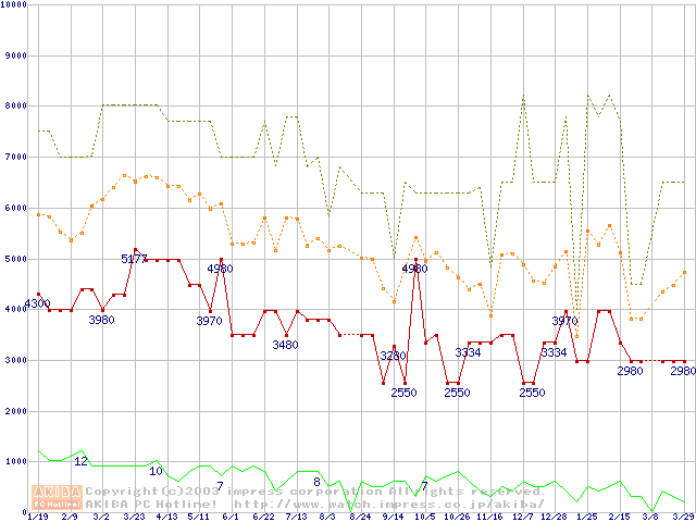 PC133 SDRAM DIMM CasLatency=3 ECC対応の最安値推移