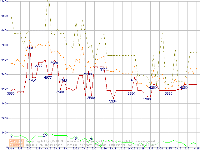 PC100 SDRAM DIMM CasLatency=2 ECC対応の最安値推移