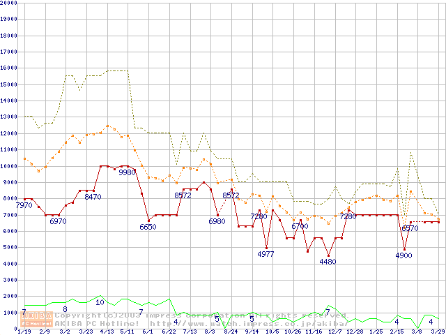 PC100 SDRAM DIMM CasLatency=2 ECC対応の最安値推移