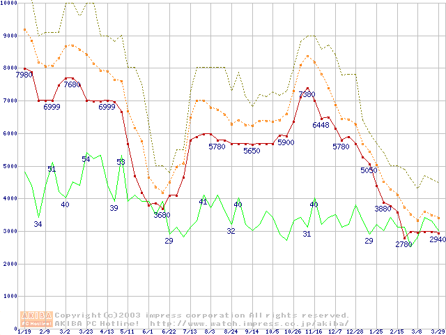 メモリ主要製品の最安値推移