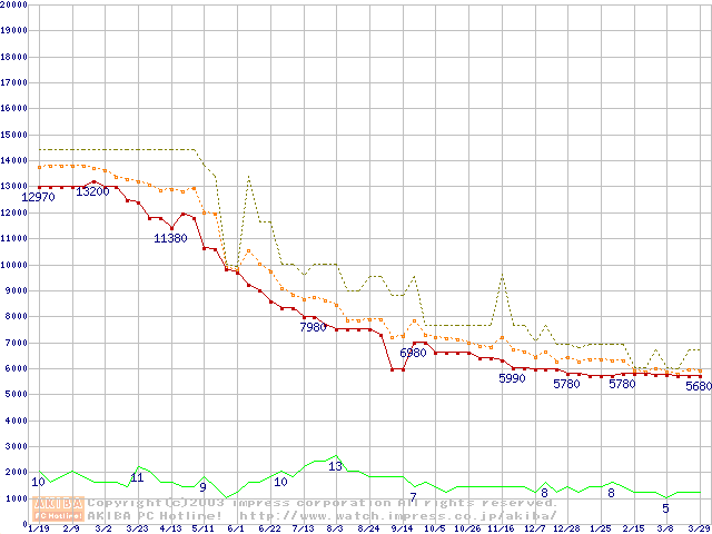 Socket A (PGA,FSB 266MHz,L2 256KB,Thunderbird)の最安値推移
