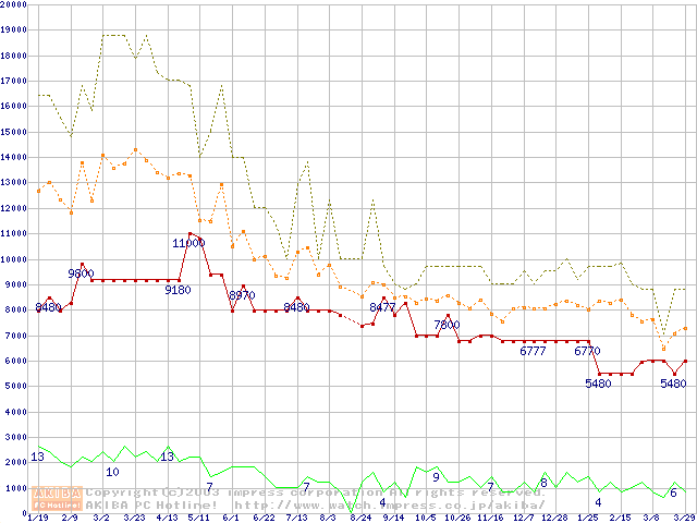 PC133 SDRAM DIMM CasLatency=3 ECC対応 Registeredタイプの最安値推移