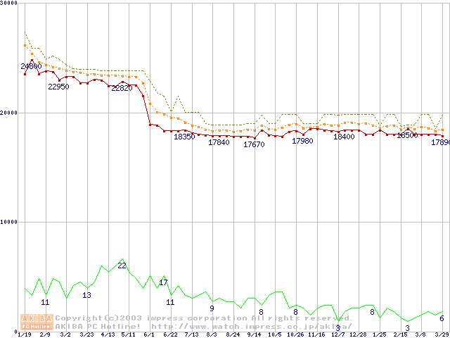 Socket 370 (FC-PGA2,FSB 133MHz,L2 512KB,Tualatin)の最安値推移