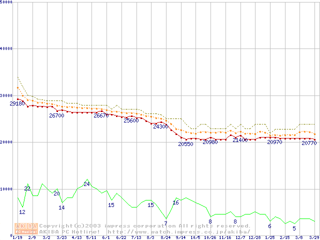 Socket 370 (FC-PGA2,FSB 133MHz,L2 512KB,Tualatin)の最安値推移