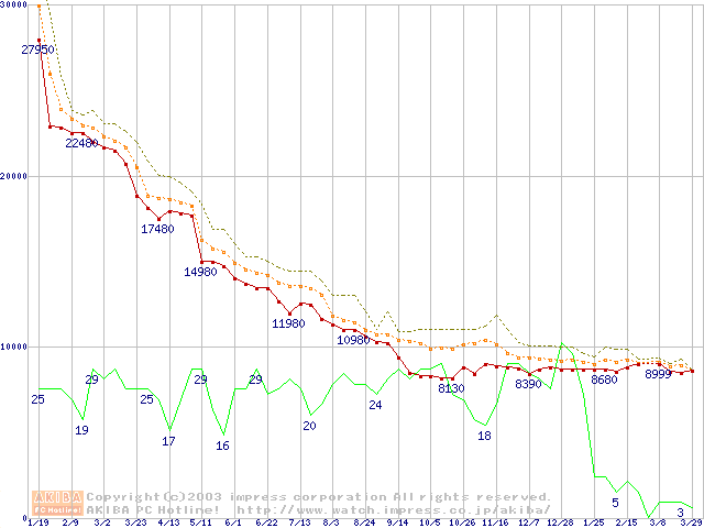 Socket A (OPGA,FSB 266MHz,L2 256KB,Palomino)の最安値推移