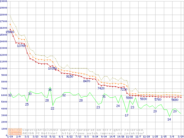 Socket 370 (FC-PGA2,FSB 100MHz,L2 256KB,Tualatin)の最安値推移