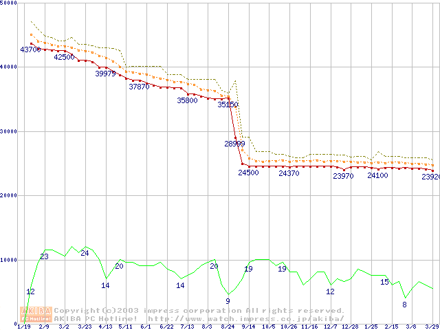 Socket 370 (FC-PGA2,FSB 133MHz,L2 512KB,Tualatin)の最安値推移