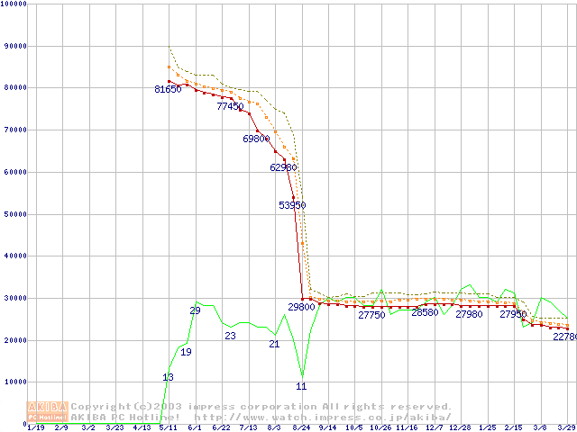 Socket 478 (micro-PGA,FSB 533MHz,L2 512KB,Northwood)の最安値推移