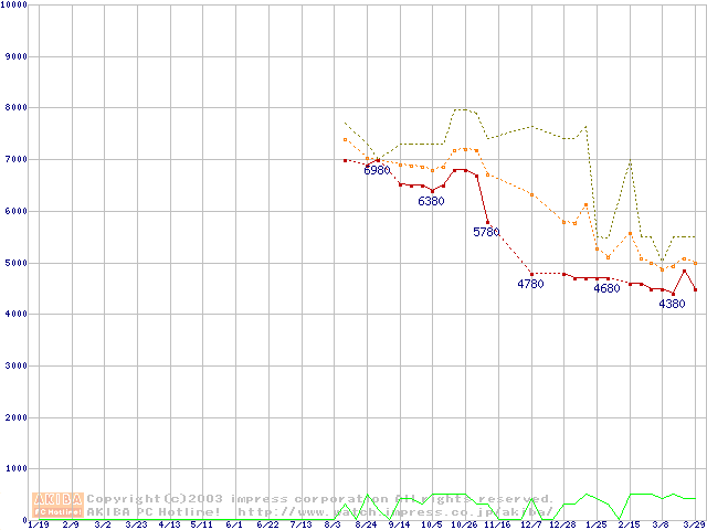 Socket 370 (FC-PGA,FSB 100MHz,L2 128KB,Coppermine)の最安値推移