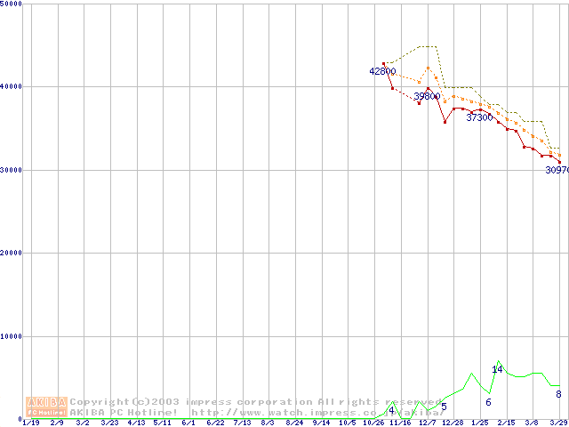 MKシリーズ (9.5mm,5400rpm,16MB,FDB,30GB/Platter)の最安値推移