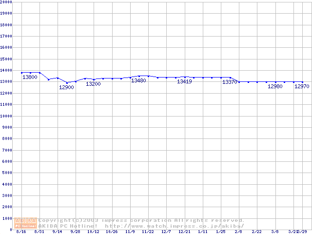 | [↑前グラフ]: | Socket 370 (FC-PGA2,FSB 133MHz,L2 512KB,Tualatin)の最安値推移 |