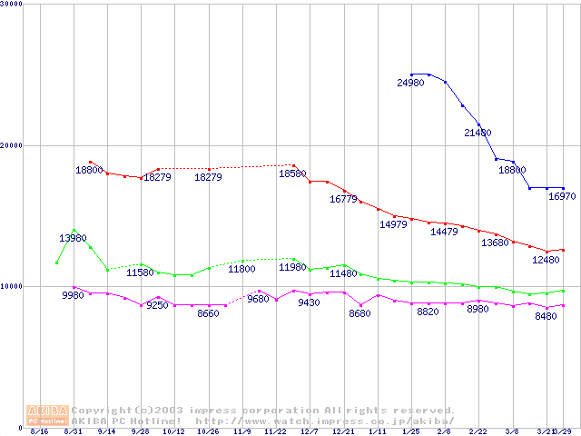| [↑前グラフ]: | DiamondMax 16 (5400rpm,UltraATA/133,2MB,80GB/Platter,BB)の最安値推移 |