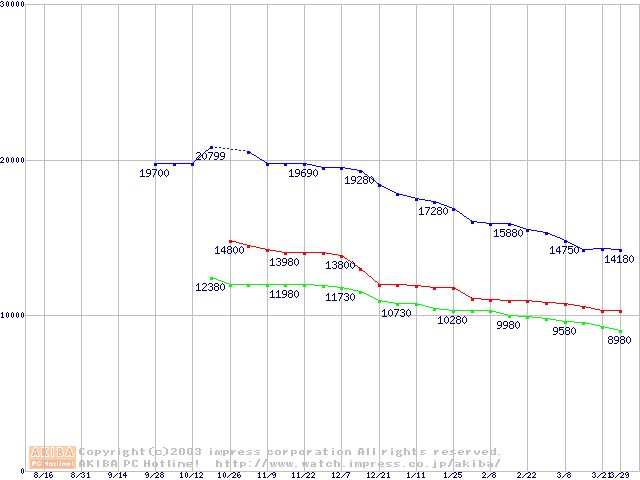 | [↓次グラフ]: | Barracuda ATA IV (7200rpm,UltraATA/100,2MB,40GB/Platter,FDB)の最安値推移 |