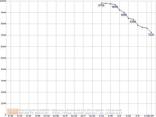 | [↑前グラフ]: | Barracuda ATA IV (7200rpm,UltraATA/100,2MB,40GB/Platter,FDB)の最安値推移 |