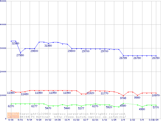 | [↑前グラフ]: | PC800-40 DRDRAM RIMMの最安値推移 |