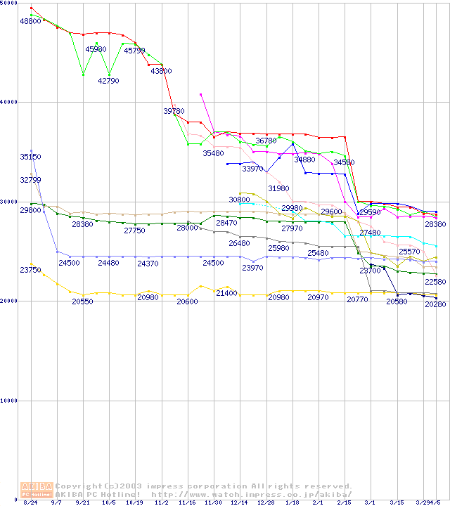 CPU主要製品(最安値2万円~3万円未満)の最安値推移