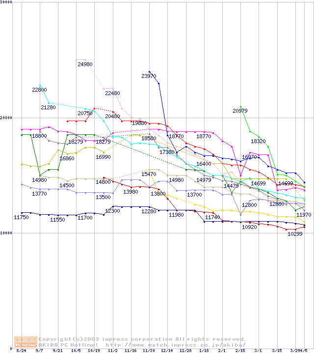 HDD主要製品(最安値1万5千円~2万円未満)の最安値推移