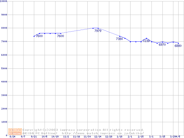 | [↑前グラフ]: | HDD 20GB~30GB未満(5400rpmクラス)の最安値推移 |