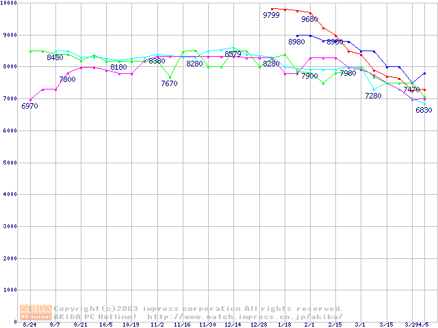 | [↑前グラフ]: | HDD 30GB~40GB未満(5400rpmクラス)の最安値推移 |