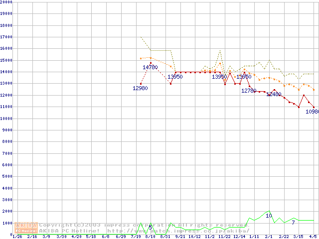 Socket 370 (FC-PGA,FSB 133MHz,L2 256KB,Coppermine)の最安値推移