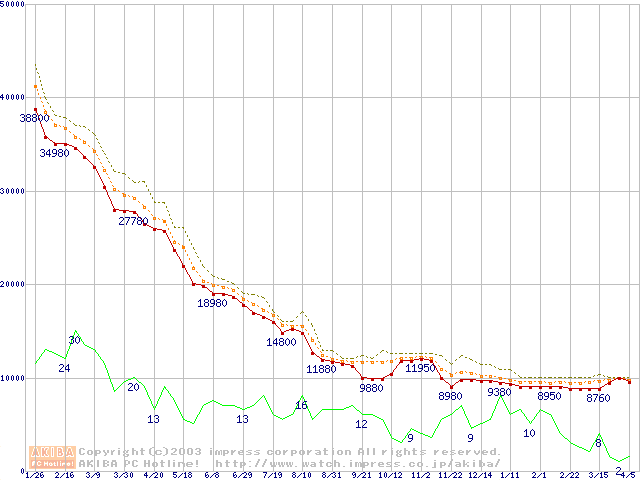 Socket A (OPGA,FSB 266MHz,L2 256KB,Palomino)の最安値推移