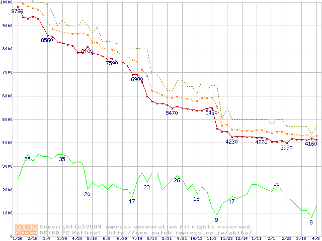 Socket 370 (FC-PGA2,FSB 100MHz,L2 256KB,Tualatin)の最安値推移