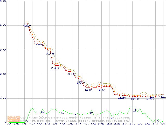 Socket A (OPGA,FSB 266MHz,L2 256KB,Palomino)の最安値推移