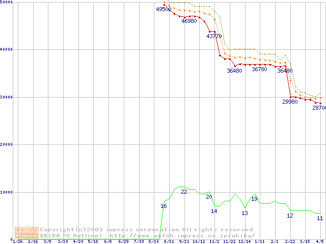 Socket 478 (micro-PGA,FSB 400MHz,L2 512KB,Northwood)の最安値推移