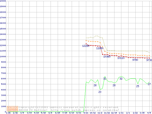Socket 478 (micro-PGA,FSB 400MHz,L2 128KB,Northwood)の最安値推移