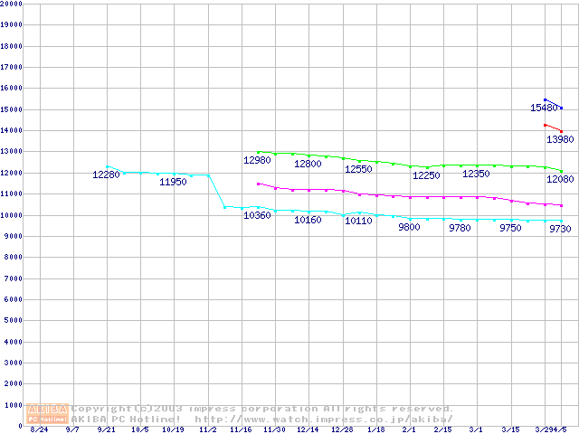 | [↓次グラフ]: | Socket 478 (micro-PGA,FSB 400MHz,L2 128KB,Willamette)の最安値推移 |