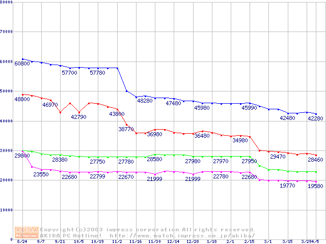 | [↑前グラフ]: | Socket 478 (micro-PGA,FSB 533MHz,L2 512KB,Hyper-Threading,Northwood)の最安値推移 |