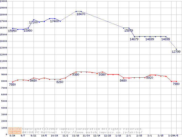 | [↑前グラフ]: | Deskstar 180GXP (7200rpm,2MB,UltraATA/100,FDB)の最安値推移 |