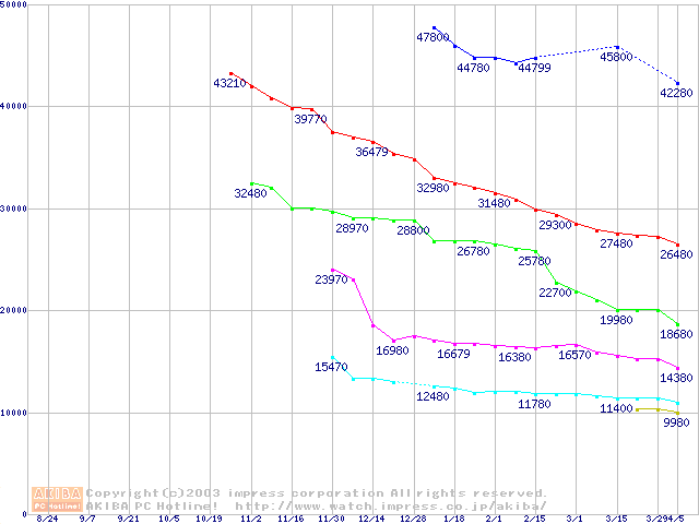 | [↑前グラフ]: | Deskstar 120GXP (7200rpm,2MB,UltraATA/100,BB)の最安値推移 |