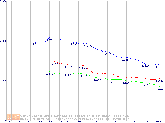 | [↓次グラフ]: | Barracuda ATA IV (7200rpm,UltraATA/100,2MB,40GB/Platter,FDB)の最安値推移 |