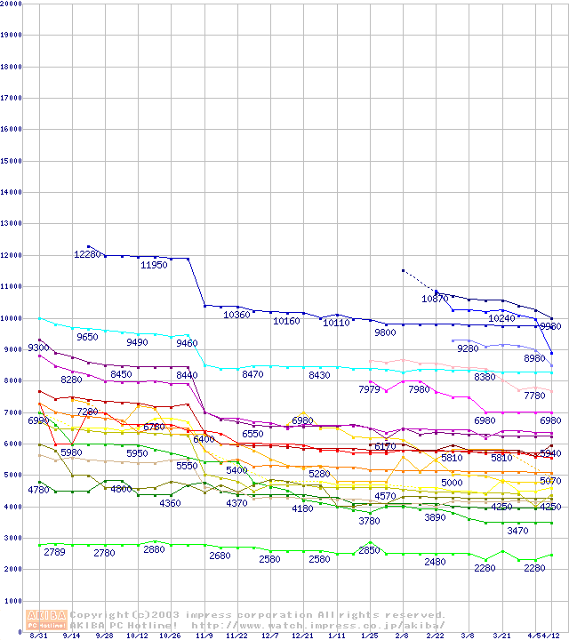 CPU主要製品(最安値1万円~2万円未満)の最安値推移