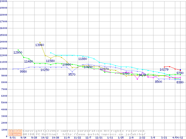 | [↑前グラフ]: | HDD 40GB~50GB未満(7200rpmクラス)の最安値推移 |