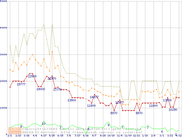 PC133 SDRAM DIMM CasLatency=3 ECC対応 Registeredタイプの最安値推移