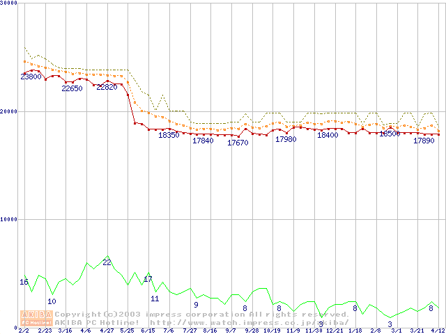Socket 370 (FC-PGA2,FSB 133MHz,L2 512KB,Tualatin)の最安値推移