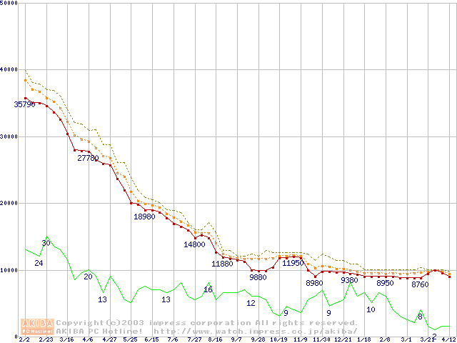 Socket A (OPGA,FSB 266MHz,L2 256KB,Palomino)の最安値推移