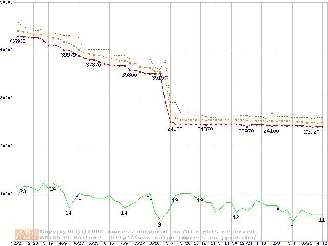 Socket 370 (FC-PGA2,FSB 133MHz,L2 512KB,Tualatin)の最安値推移